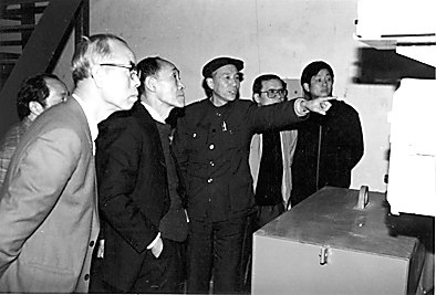 郁铭芳(右三)参加上海合成纤维研究所“丙纶喷丝直接成布”项目鉴定会