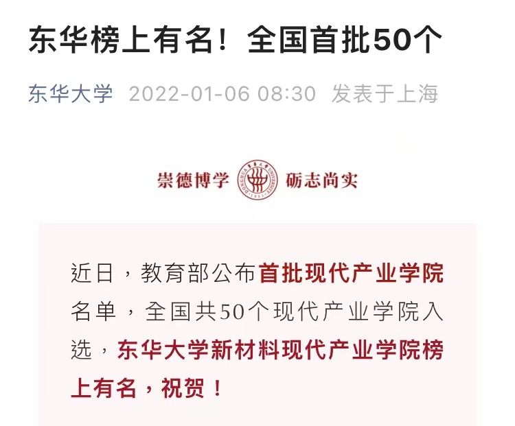 2021年,继获批为上海市首批现代产业学院后,再获批国家首批现代产业学院。新材料现代产业学院实施1+3+5+X管理形式,引进中国商飞上海飞机制造有限公司等5家主要合作企业参与,突出服务国家重大战略、突出实践育人,突出科教融合、突出立德树人,注重创新赋能、工程导向、教研相长。
