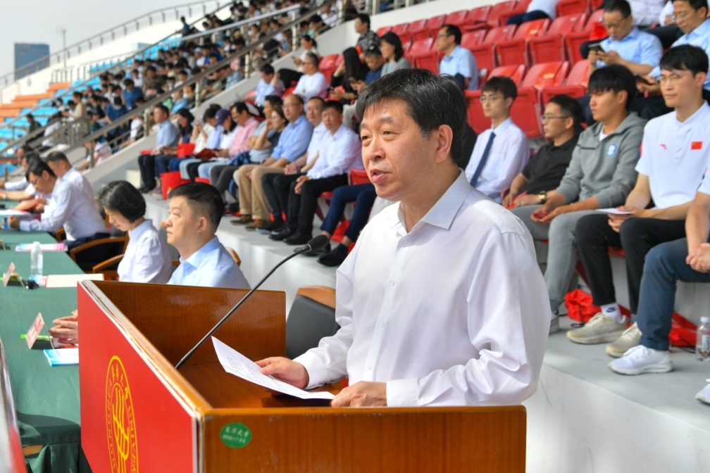 俞建勇在致辞中指出,体育工作是落实立德树人根本任务、提升学生综合素质的基础性工程,是德智体美劳“五育并举”中不可或缺的组成部分。长期以来,学校将群众体育活动和竞技体育统一部署、一体推进,搭建丰富的体育教育平台,支持各类教职工体育协会、学生体育社团建设,践行“以体育人、以体育智、以体育心”教育理念。希望全体运动员发扬崇高的体育精神,顽强拼搏,突破自我;全体裁判员和工作人员恪尽职守,创造公平、公正的竞赛环境;全校师生在运动会平台上加强交流,互相学习,增进友谊,弘扬东华精神,凝聚东华力量。